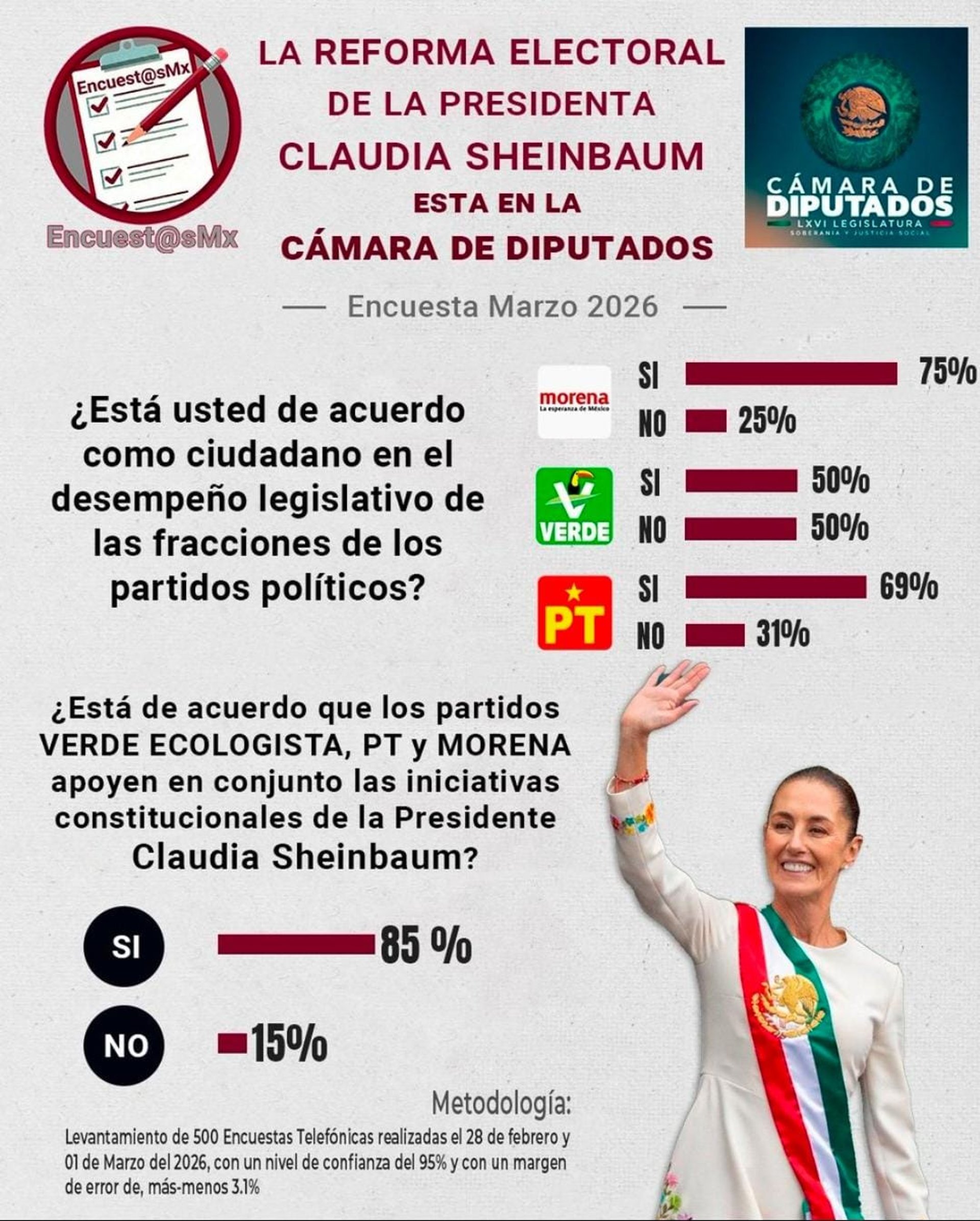 La Reforma Electoral de la Presidenta Claudia Sheinbaum Pardo, está en Cámara de Diputados con un Resultado contundente del apoyo ciudadano encuestado en favor a la REFORMA CONSTITUCIONAL ELECTORAL, iniciativa realizada por la Comisión Presidencial. •Jesus Ramirez Cuevas •Pablo Gomez •Rosa Icela Rodriguez •Jose Merino •Arturo Zaldivar •Lazaro Cardenas Batel